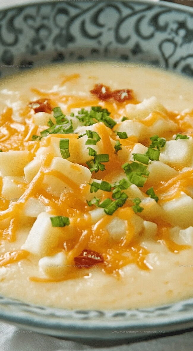 - Ladle into serving bowls and garnish with chopped chives, crispy bacon bits, or additional shredded cheese as desired.