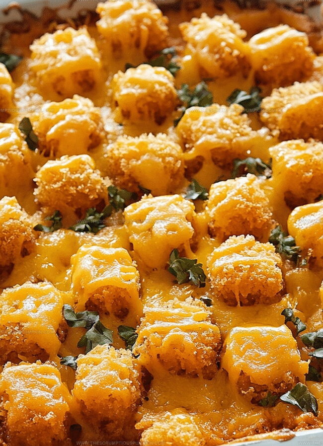 Midwestern comfort shines in this cheesy tater tot casserole, blending hearty ground beef with crispy potato bites. Golden layers of melted cheese and savory filling make this dish a crowd-pleasing favorite you’ll crave again and again.