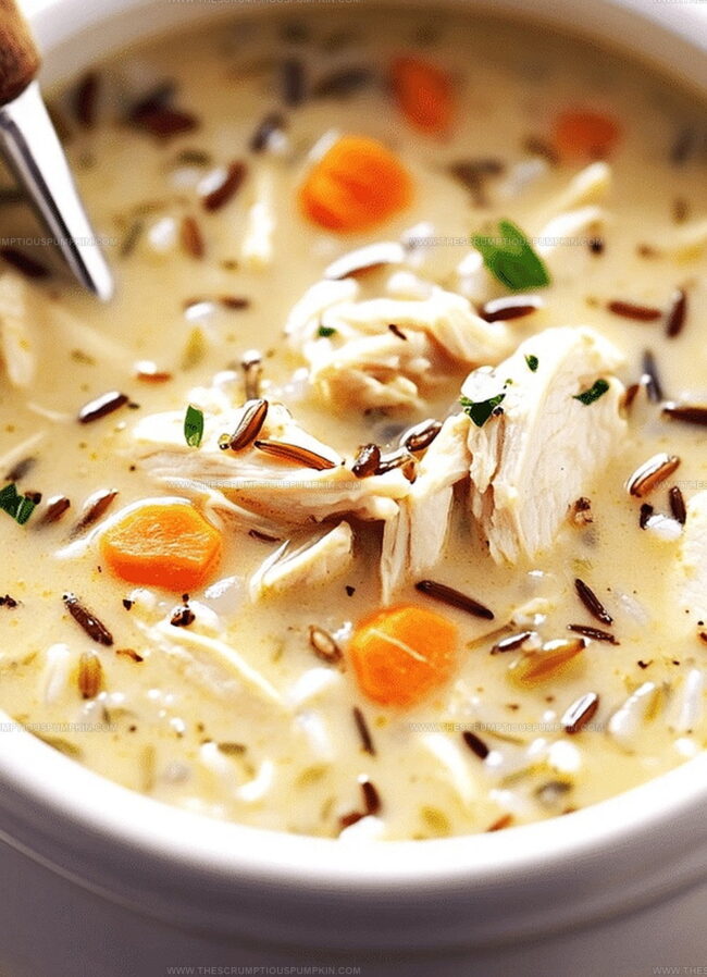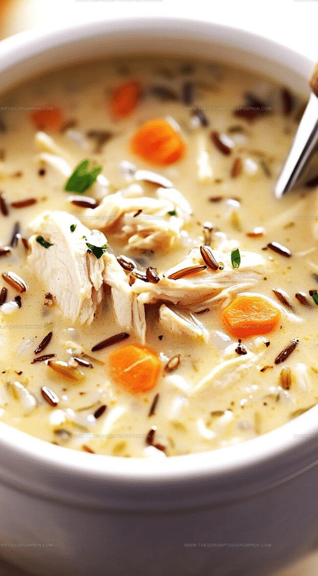 Comfort arrives in a steaming bowl of hearty chicken and wild rice soup that promises warmth and satisfaction.
