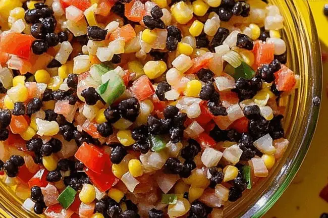 Drain black beans and corn completely. Dice tomatoes, red onion, bell peppers, cilantro, and jalapeños into consistent small pieces. Make sure each vegetable is cut to roughly the same size for a balanced bite.