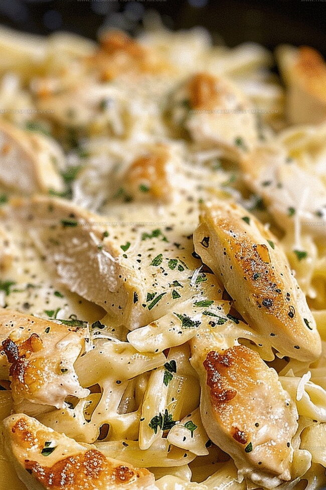 Succulent chicken pieces nestle among tender noodles, blanketed in a luxurious sauce that whispers of garlic and sharp parmesan.