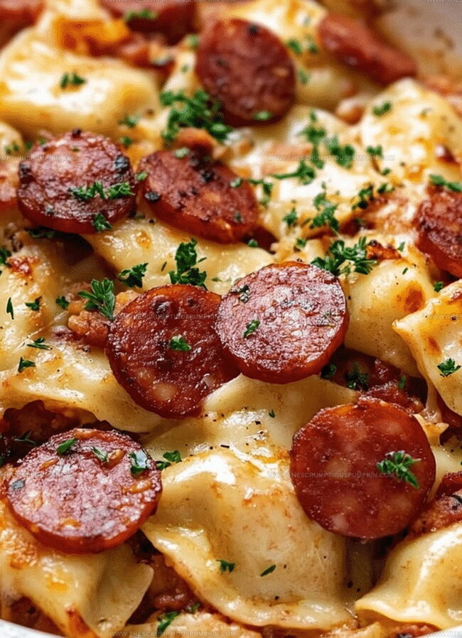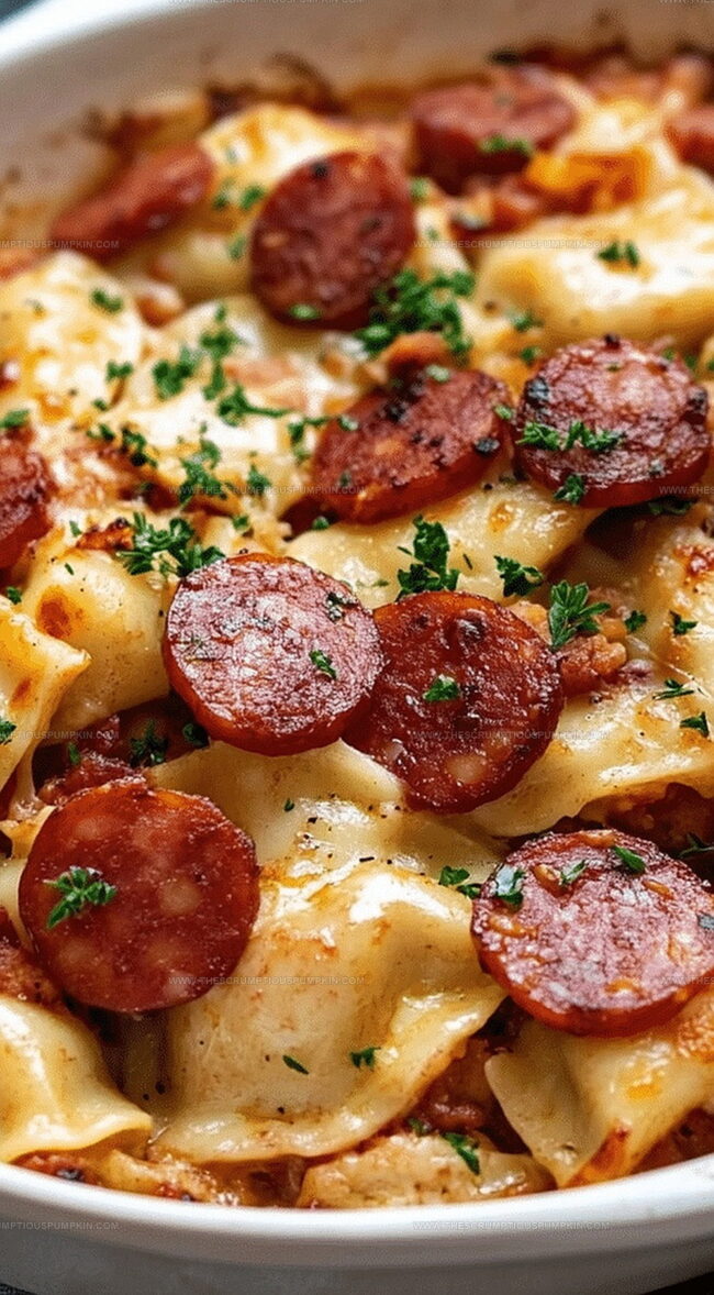 Layers of tender pierogies nestle alongside smoky sausage for an effortless meal.