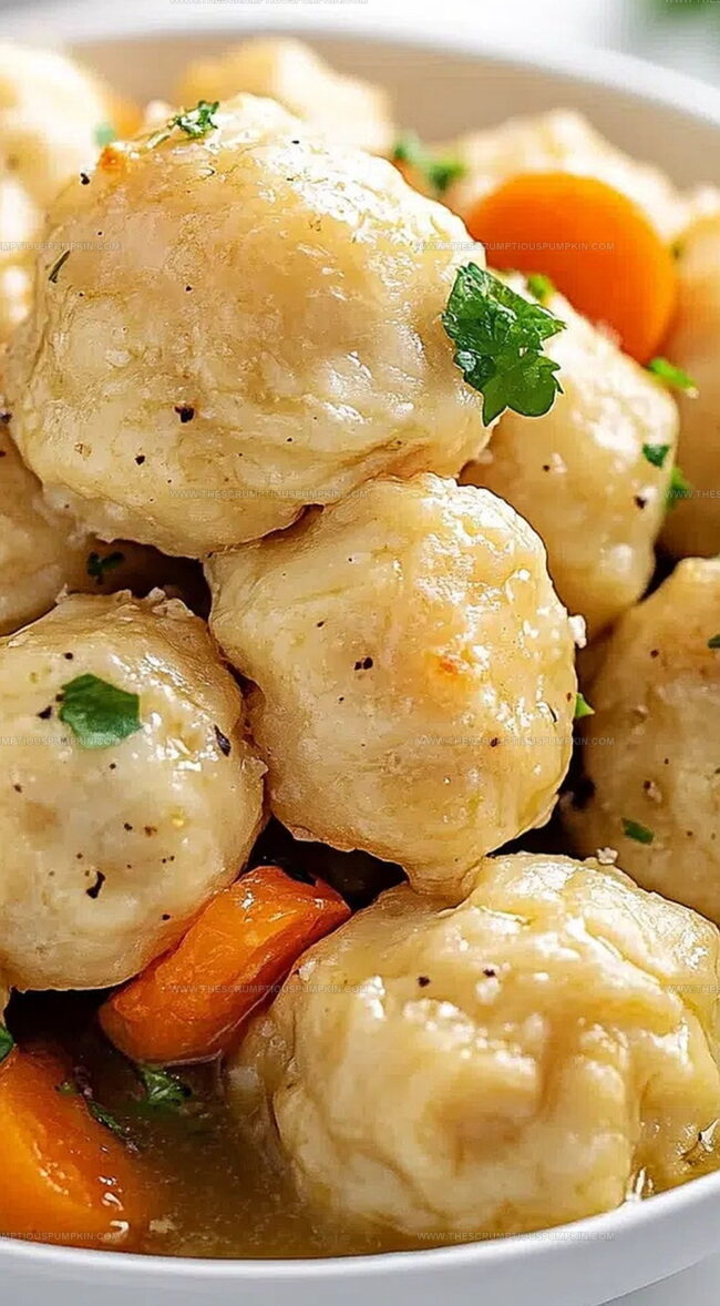 Soft clouds of dough float gently in rich, savory broth, promising pure culinary satisfaction.