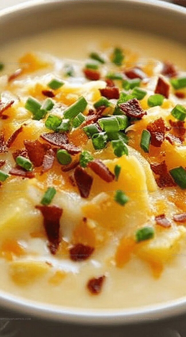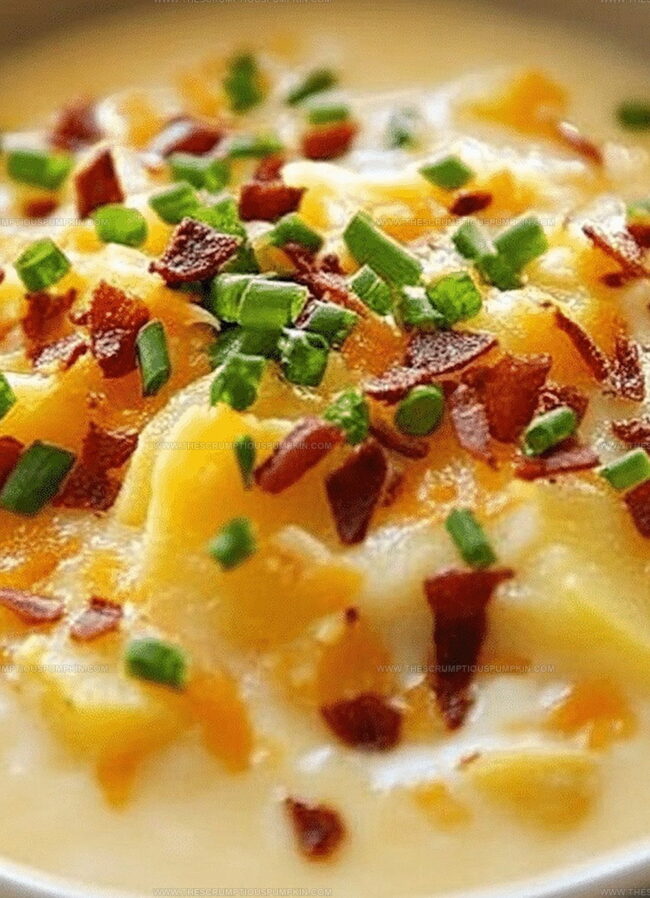 Creamy loaded potato soup brings comfort straight from hearty Midwestern kitchens, packed with crispy bacon, sharp cheddar, and green onion garnish. Warm spoons of this soul-satisfying soup will transport you to a delightful culinary embrace of pure, rich flavor.