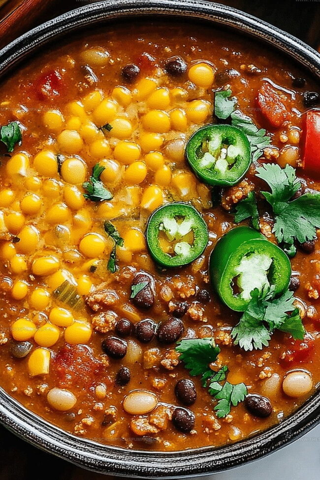 - Ladle into serving bowls and garnish with optional toppings like Pico de Gallo, crushed tortilla chips, shredded cheese, sour cream, sliced avocado, or additional jalapeno slices.