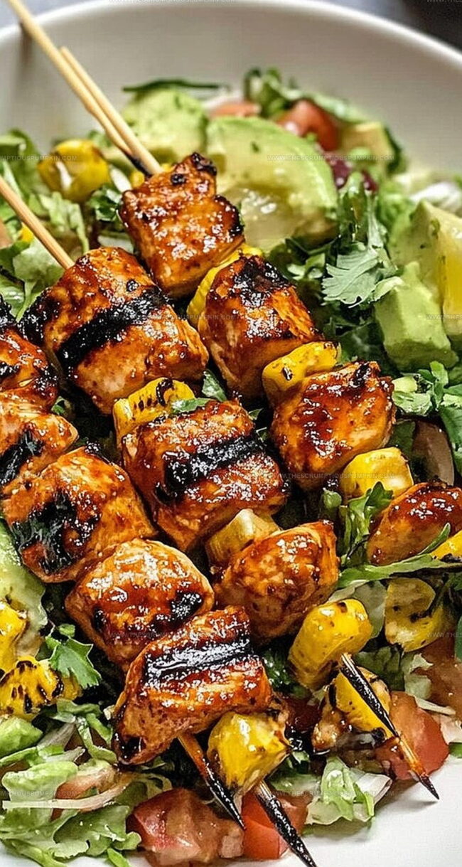 - Transfer grilled chicken skewers directly atop dressed salad mixture.