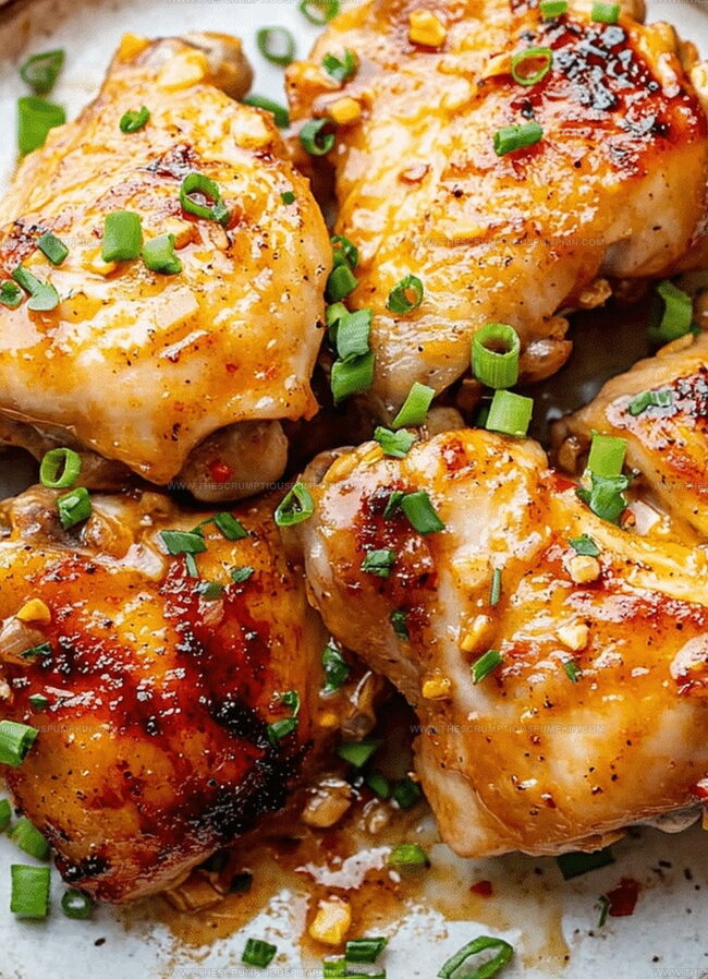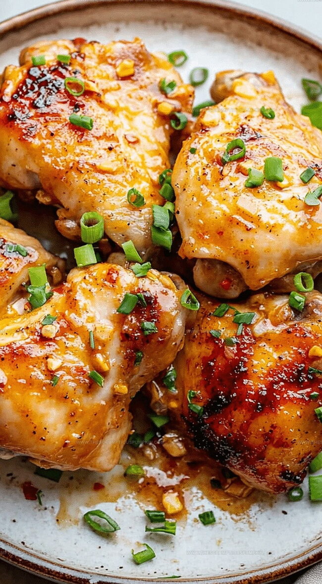 Sprinkle freshly chopped green onions over the sauced chicken thighs.