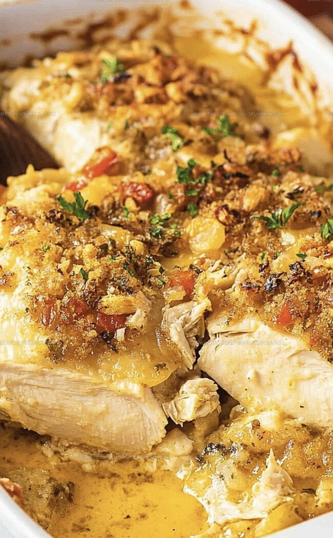 In a mixing bowl, whisk together:Pour this silky mixture evenly over the chicken, ensuring every inch gets covered in creamy goodness.
