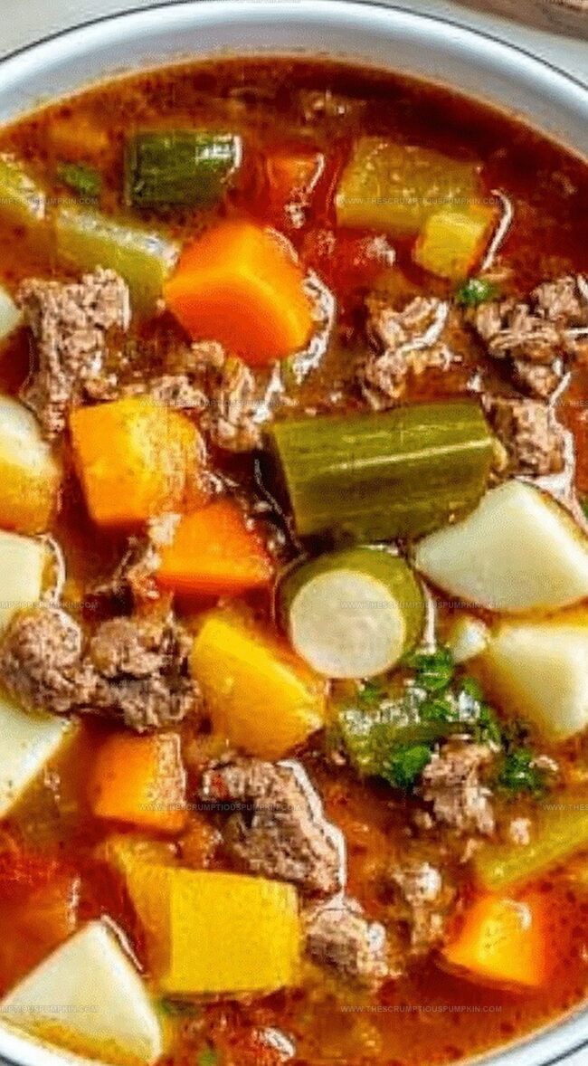 Rich beef chunks mingle with colorful vegetables in a deeply satisfying broth.
